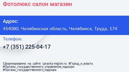 Фотолюкс, салон-магазин по адресу 454080, Челябинская область, Челябинск, Труда, 174 в дальнейшем Организация, размещена в следующих категориях: