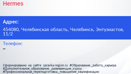 Hermes по адресу 454080, Челябинская область, Челябинск, Энтузиастов, 11/2 в дальнейшем Организация, размещена в следующих категориях: