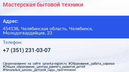 Мастерская бытовой техники по адресу 454138, Челябинская область, Челябинск, Молодогвардейцев, 23 в дальнейшем Организация, размещена в следующих категориях: