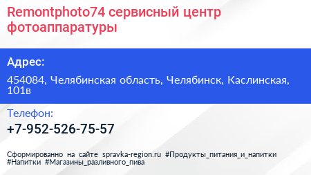 Remontphoto74, сервисный центр фотоаппаратуры по адресу 454084, Челябинская область, Челябинск, Каслинская, 101в в дальнейшем Организация, размещена в следующих категориях: