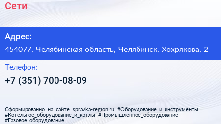 Для связи с организацией воспользуйтесь номером телефона: +7 (351) 700-08-09. Пн: c 09:00-18:00, Вт: c 09:00-18:00, Ср: c 09:00-18:00, Чт: c 09:00-18:00, Пт: c 09:00-18:00, Сб: выходной, Вс: выходной, вы можете обратиться в эту организацию.