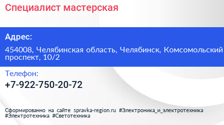 Специалист, мастерская по адресу 454008, Челябинская область, Челябинск, Комсомольский проспект, 10/2 в дальнейшем Организация, размещена в следующих категориях: