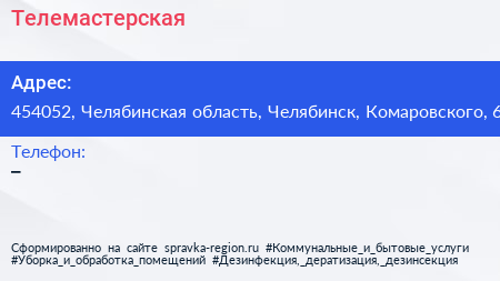Телемастерская по адресу 454052, Челябинская область, Челябинск, Комаровского, 6 в дальнейшем Организация, размещена в следующих категориях: