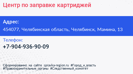 Центр по заправке картриджей по адресу 454077, Челябинская область, Челябинск, Мамина, 13 в дальнейшем Организация, размещена в следующих категориях: