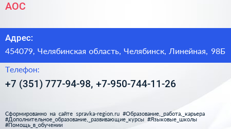 АОС по адресу 454079, Челябинская область, Челябинск, Линейная, 98Б в дальнейшем Организация, размещена в следующих категориях: