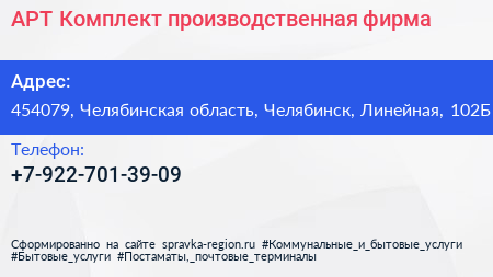 АРТ-Комплект, производственная фирма по адресу 454079, Челябинская область, Челябинск, Линейная, 102Б в дальнейшем Организация, размещена в следующих категориях: