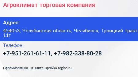 Агроклимат, торговая компания по адресу 454053, Челябинская область, Челябинск, Троицкий тракт, 11г в дальнейшем Организация, размещена в следующих категориях: