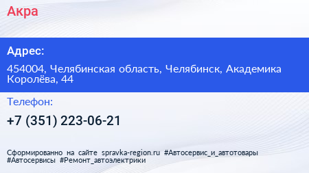 Акра по адресу 454004, Челябинская область, Челябинск, Академика Королёва, 44 в дальнейшем Организация, размещена в следующих категориях: