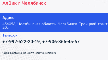 АлВик, г. Челябинск по адресу 454053, Челябинская область, Челябинск, Троицкий тракт, 20а в дальнейшем Организация, размещена в следующих категориях: