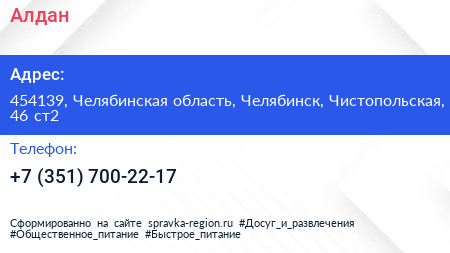 Алдан по адресу 454139, Челябинская область, Челябинск, Чистопольская, 46 ст2 в дальнейшем Организация, размещена в следующих категориях:
