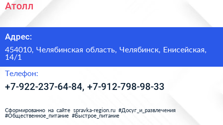 Атолл по адресу 454010, Челябинская область, Челябинск, Енисейская, 14/1 в дальнейшем Организация, размещена в следующих категориях: