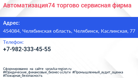 Автоматизация74, торгово-сервисная фирма по адресу 454084, Челябинская область, Челябинск, Каслинская, 77 в дальнейшем Организация, размещена в следующих категориях:
