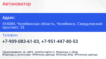 Автоноватор по адресу 454084, Челябинская область, Челябинск, Свердловский проспект, 31 в дальнейшем Организация, размещена в следующих категориях: