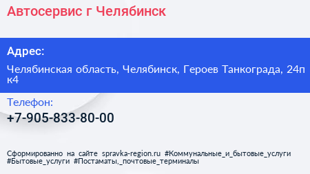 Автосервис, г. Челябинск по адресу Челябинская область, Челябинск, Героев Танкограда, 24п к4 в дальнейшем Организация, размещена в следующих категориях: