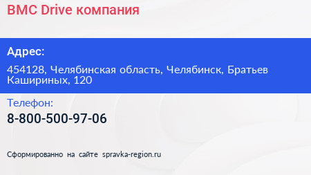 BMC Drive, компания по адресу 454128, Челябинская область, Челябинск, Братьев Кашириных, 120 в дальнейшем Организация, размещена в следующих категориях: