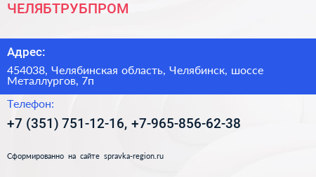 ЧЕЛЯБТРУБПРОМ по адресу 454038, Челябинская область, Челябинск, шоссе Металлургов, 7п в дальнейшем Организация, размещена в следующих категориях: