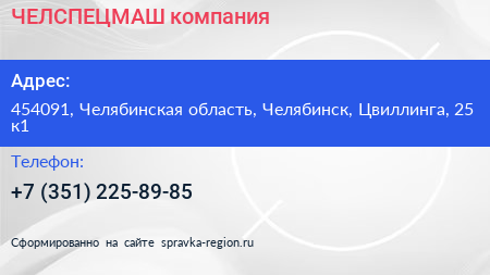 ЧЕЛСПЕЦМАШ, компания по адресу 454091, Челябинская область, Челябинск, Цвиллинга, 25 к1 в дальнейшем Организация, размещена в следующих категориях: