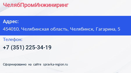 ЧелябПромИнжиниринг по адресу 454010, Челябинская область, Челябинск, Гагарина, 5 в дальнейшем Организация, размещена в следующих категориях: