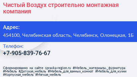 Чистый Воздух, строительно-монтажная компания по адресу 454100, Челябинская область, Челябинск, Олонецкая, 1Б в дальнейшем Организация, размещена в следующих категориях: