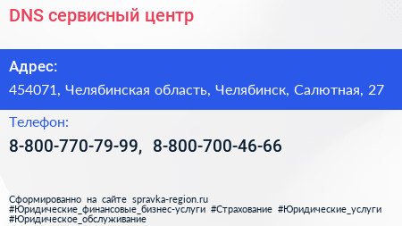 DNS, сервисный центр по адресу 454071, Челябинская область, Челябинск, Салютная, 27 в дальнейшем Организация, размещена в следующих категориях: