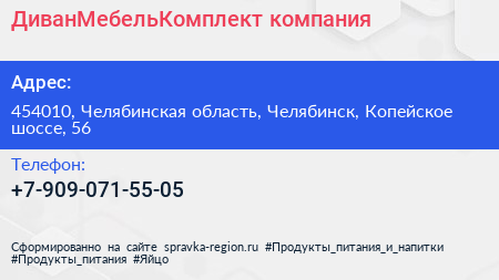 ДиванМебельКомплект, компания по адресу 454010, Челябинская область, Челябинск, Копейское шоссе, 56 в дальнейшем Организация, размещена в следующих категориях: