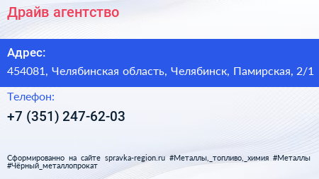 Драйв, агентство по адресу 454081, Челябинская область, Челябинск, Памирская, 2/1 в дальнейшем Организация, размещена в следующих категориях: