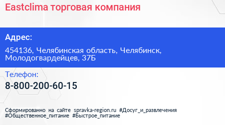 Eastclima, торговая компания по адресу 454136, Челябинская область, Челябинск, Молодогвардейцев, 37Б в дальнейшем Организация, размещена в следующих категориях: