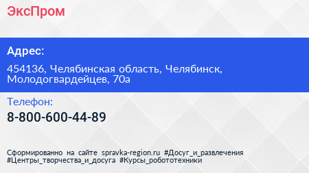 ЭксПром по адресу 454136, Челябинская область, Челябинск, Молодогвардейцев, 70а в дальнейшем Организация, размещена в следующих категориях: