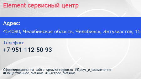 Element, сервисный центр по адресу 454080, Челябинская область, Челябинск, Энтузиастов, 15 в дальнейшем Организация, размещена в следующих категориях: