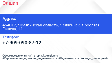 Элшип по адресу 454017, Челябинская область, Челябинск, Ярослава Гашека, 14 в дальнейшем Организация, размещена в следующих категориях: