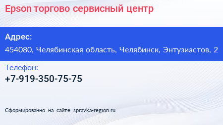 Epson, торгово-сервисный центр по адресу 454080, Челябинская область, Челябинск, Энтузиастов, 2 в дальнейшем Организация, размещена в следующих категориях: