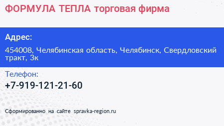 ФОРМУЛА ТЕПЛА, торговая фирма по адресу 454008, Челябинская область, Челябинск, Свердловский тракт, 3к в дальнейшем Организация, размещена в следующих категориях: