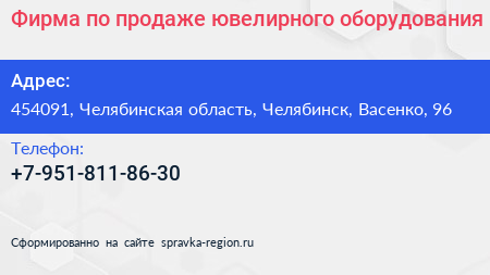 Фирма по продаже ювелирного оборудования по адресу 454091, Челябинская область, Челябинск, Васенко, 96 в дальнейшем Организация, размещена в следующих категориях: