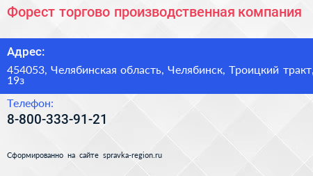Форест, торгово-производственная компания по адресу 454053, Челябинская область, Челябинск, Троицкий тракт, 19з в дальнейшем Организация, размещена в следующих категориях: