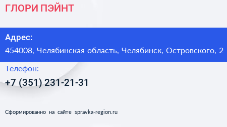 ГЛОРИ ПЭЙНТ по адресу 454008, Челябинская область, Челябинск, Островского, 2 в дальнейшем Организация, размещена в следующих категориях:
