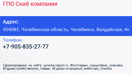 ГПО-Снаб, компания по адресу 454081, Челябинская область, Челябинск, Валдайская, 4п в дальнейшем Организация, размещена в следующих категориях: