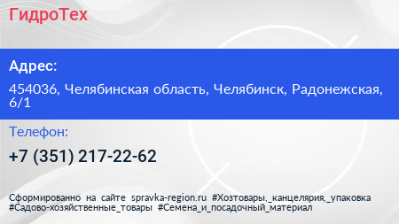 ГидроТех по адресу 454036, Челябинская область, Челябинск, Радонежская, 6/1 в дальнейшем Организация, размещена в следующих категориях: