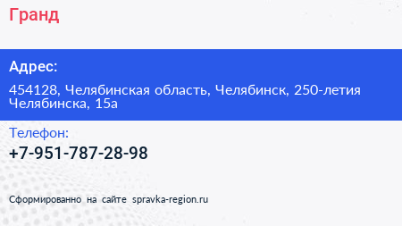 Гранд+ по адресу 454128, Челябинская область, Челябинск, 250-летия Челябинска, 15а в дальнейшем Организация, размещена в следующих категориях: