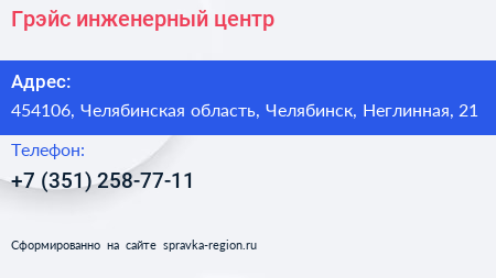 Грэйс, инженерный центр по адресу 454106, Челябинская область, Челябинск, Неглинная, 21 в дальнейшем Организация, размещена в следующих категориях: