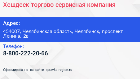 Хешдеск, торгово-сервисная компания по адресу 454007, Челябинская область, Челябинск, проспект Ленина, 2в в дальнейшем Организация, размещена в следующих категориях:
