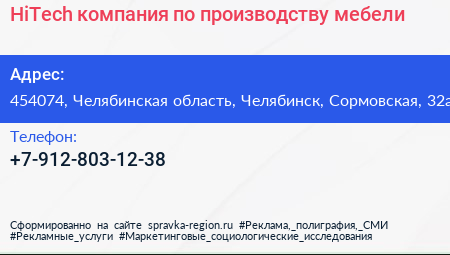 HiTech, компания по производству мебели по адресу 454074, Челябинская область, Челябинск, Сормовская, 32а в дальнейшем Организация, размещена в следующих категориях: