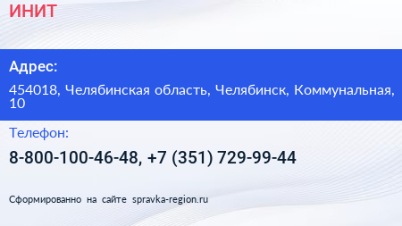 ИНИТ по адресу 454018, Челябинская область, Челябинск, Коммунальная, 10 в дальнейшем Организация, размещена в следующих категориях: