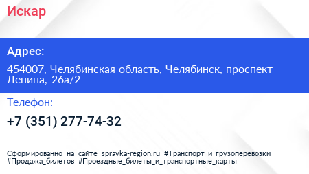 Искар по адресу 454007, Челябинская область, Челябинск, проспект Ленина, 26а/2 в дальнейшем Организация, размещена в следующих категориях: