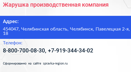 Жарушка, производственная компания по адресу 454047, Челябинская область, Челябинск, Павелецкая 2-я, 18 в дальнейшем Организация, размещена в следующих категориях: