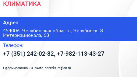 КЛИМАТИКА по адресу 454006, Челябинская область, Челябинск, 3 Интернационала, 63 в дальнейшем Организация, размещена в следующих категориях: