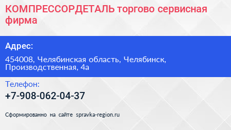 КОМПРЕССОРДЕТАЛЬ, торгово-сервисная фирма по адресу 454008, Челябинская область, Челябинск, Производственная, 4а в дальнейшем Организация, размещена в следующих категориях: