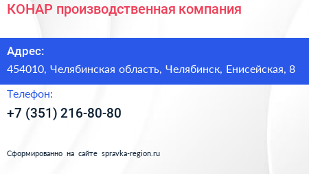 КОНАР, производственная компания по адресу 454010, Челябинская область, Челябинск, Енисейская, 8 в дальнейшем Организация, размещена в следующих категориях: