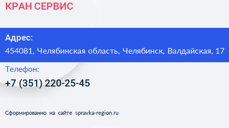КРАН-СЕРВИС по адресу 454081, Челябинская область, Челябинск, Валдайская, 17 в дальнейшем Организация, размещена в следующих категориях: