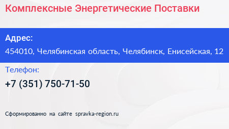 Комплексные Энергетические Поставки по адресу 454010, Челябинская область, Челябинск, Енисейская, 12 в дальнейшем Организация, размещена в следующих категориях: