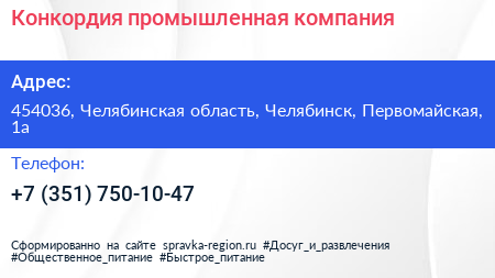 Конкордия, промышленная компания по адресу 454036, Челябинская область, Челябинск, Первомайская, 1а в дальнейшем Организация, размещена в следующих категориях: